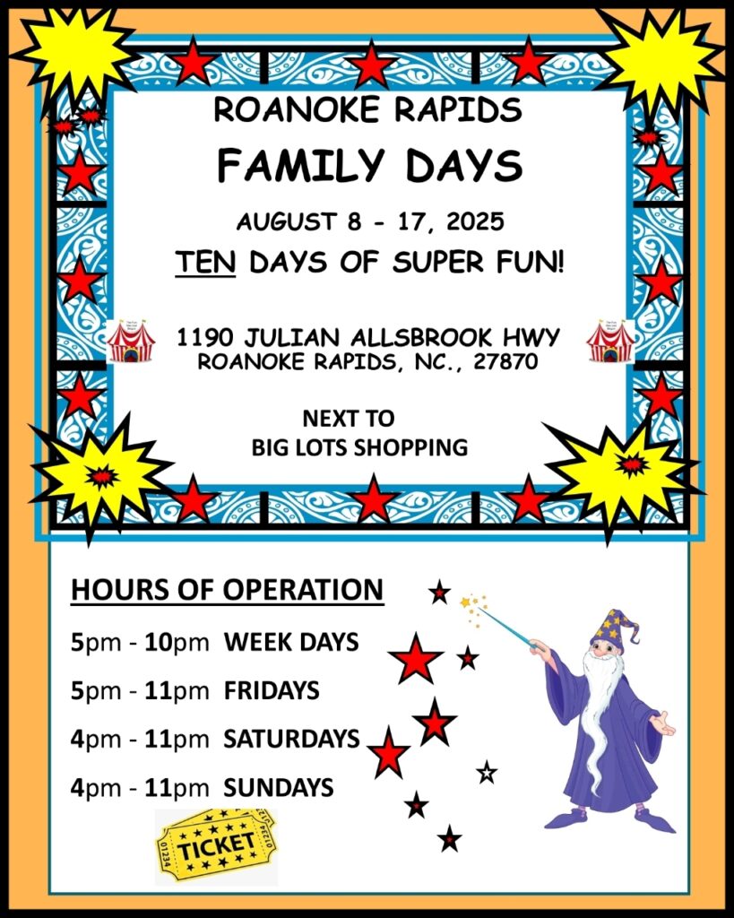 “ROANOKE RAPIDS Family Days” Post with as many Friends as possible! Good Luck!